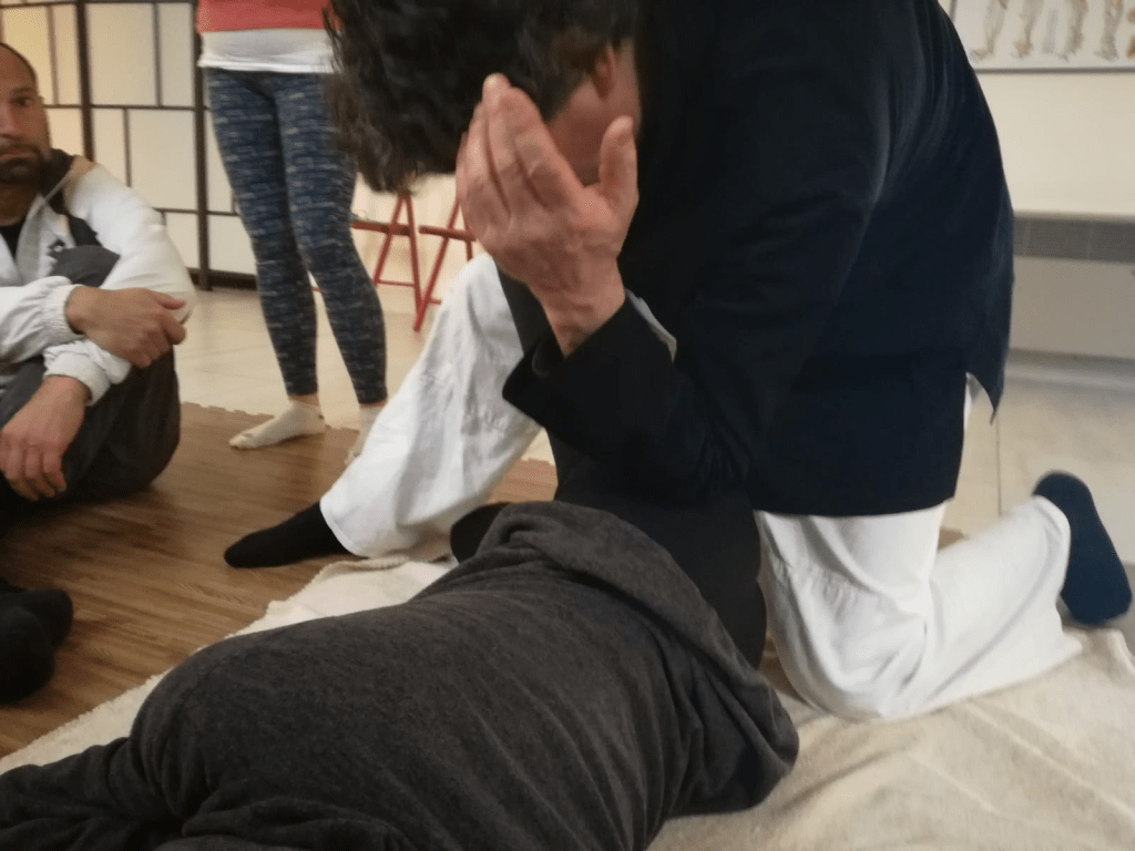 A parte i grandi movimenti come questo nella foto sotto, dove gli arti vengono spostati di decine di centimetri, tanto per usare i numeri, la grande e meritata fama dello Shiatsu è legata a movimenti ben più modesti in termini di lunghezza/spazio, quei movimenti portati dall’operatore dove ci si sposta al massimo di qualche centimetro, dal contatto con la pelle del paziente andando con perpendicolarità in genere verso il centro del corpo o dell’arto che stiamo trattando, cercando la adeguata profondità.