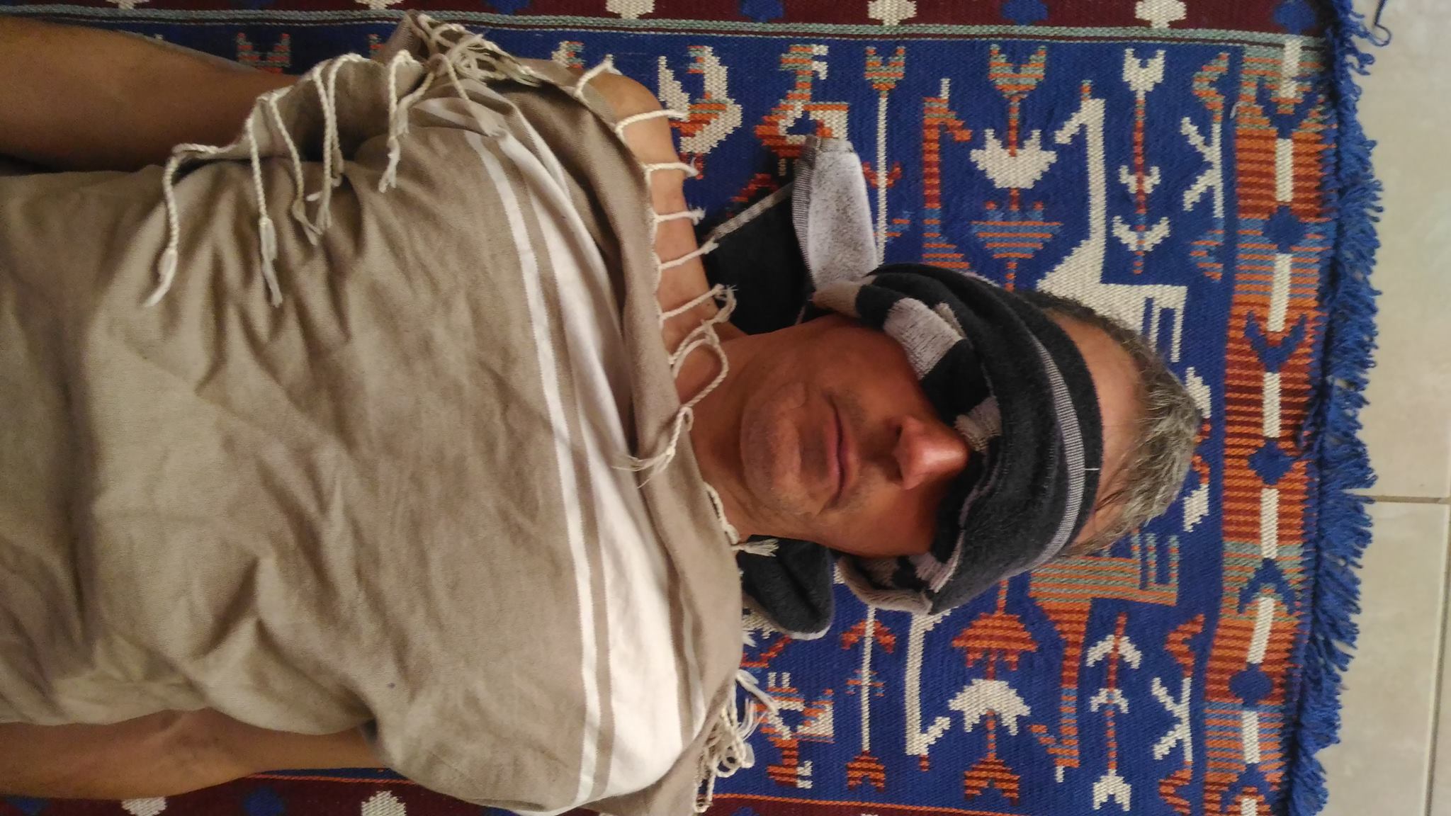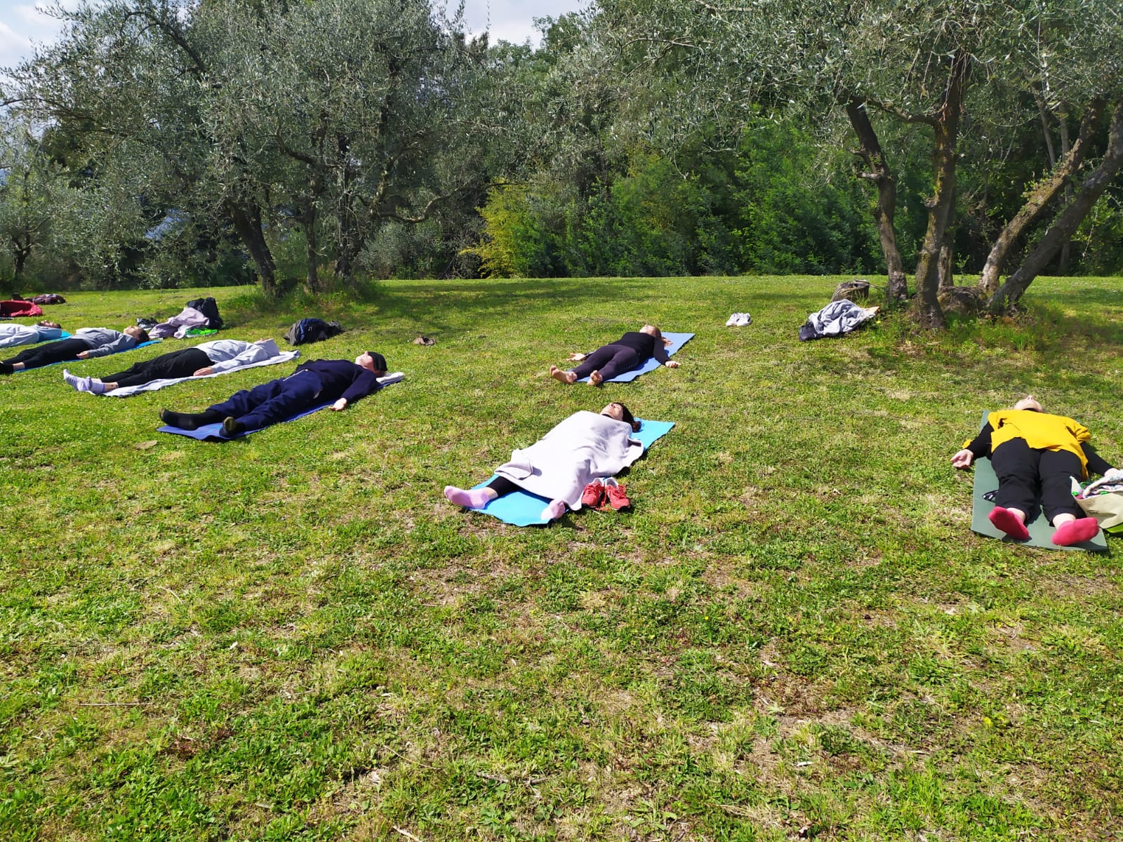 L’atteggiamento da avere quando ci stendiamo a terra è quello di lasciarsi andare giù, lasciare andare giù tutto il nostro corpo… Lasciando che il nostro corpo affondi nel tappeto, lasciando anche distendere tutta la pelle del nostro viso, tutta la pelle della nostra fronte, gli occhi e tutta la pelle intorno agli occhi, la bocca e tutta la pelle intorno alla nostra bocca.