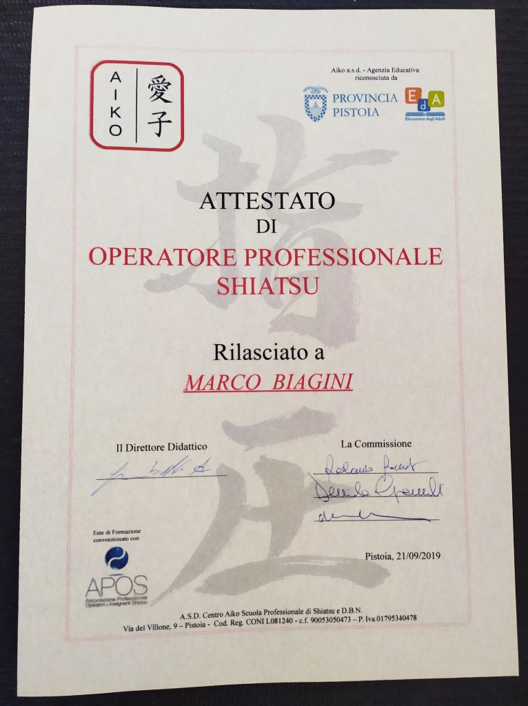 Nel 2019 ho completato un percorso formativo professionale in Shiatsu di tre anni seguendo gli insegnamenti della scuola “AIKO” di Pistoia e dei miei insegnanti Alessandro Gambetta, Remo Martini, Rolando Romoli.